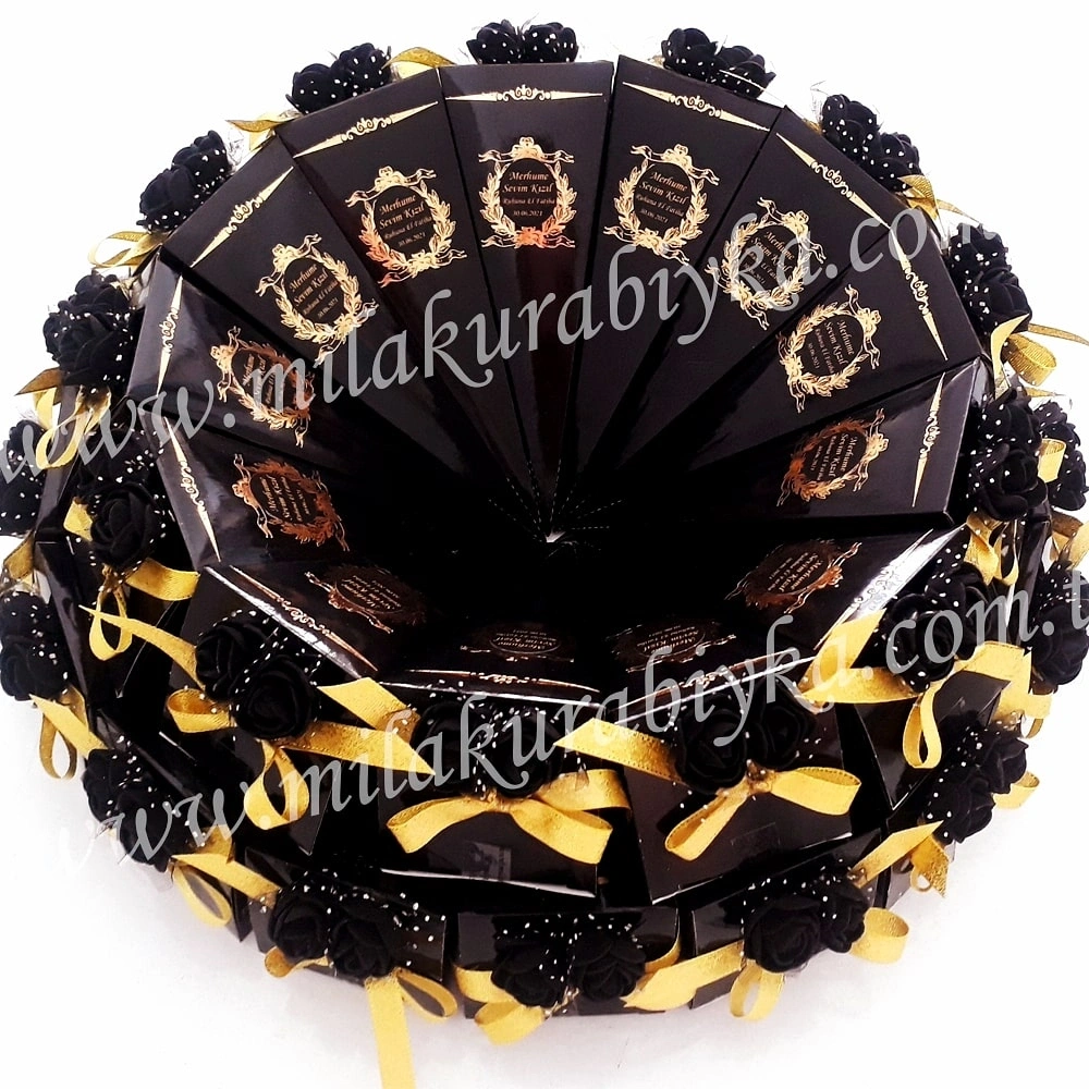* İsimli Mevlüt Şekeri: Siyah gül figürü ve gold kurdele ile süslenmiş, altın yaldızlı siyah külah içinde, sunumuyla hayran bırakacak özel şekerleme ( 6 x 16 cm.)