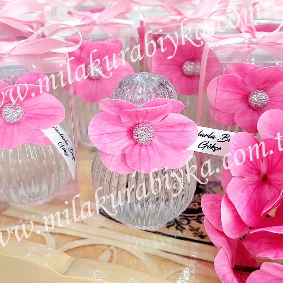 50 cc şeffaf kutulu ortancasüslemeli kişiye özel etiketli söz, nişan, nikah, düğün, doğum günü, mevlüt ve bebek hediyesi cam şişe kolonya.