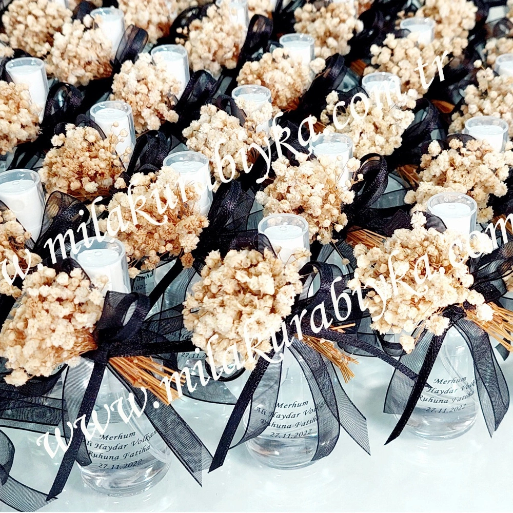 * 50 cc plastik sprey şişeli gül suyu hediyelik, kuru çiçekler ve kurdelelerle süslenerek, kişiye özel hazırlanmaktadır.