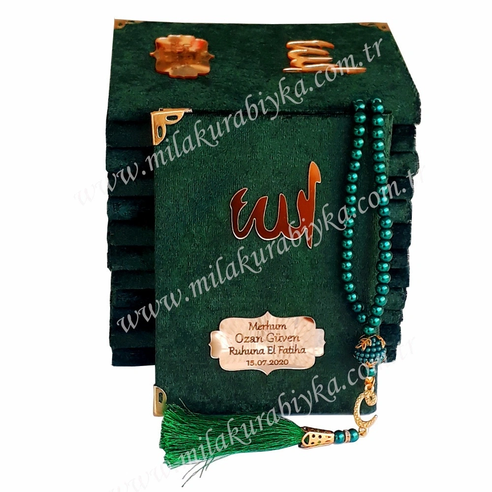 * İsme Özel Yeşil Kadife Yasin: 128 sayfa, kadife kaplaması ve üzerine eklenen gold pleksi isimlik ile tamamen size özel hazırlanır. Çanta boyu sayesinde taşıması kolay, okunuşu konforludur ( 12 x 16 cm.)