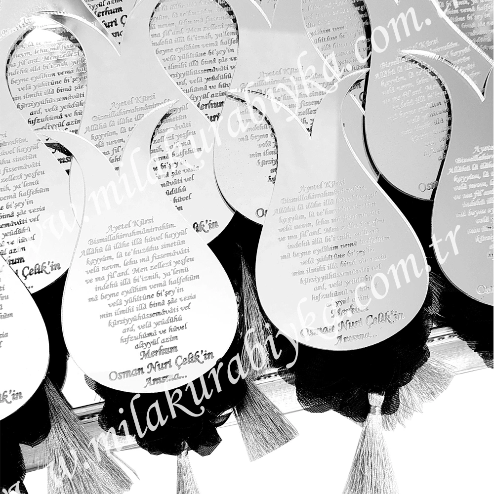 * Özel Tasarım Detayları: Lale formunun zarafeti, beyaz tül çiçek ve püskülle zenginleştirilmiştir. Gümüş püskül, ürüne hareketli ve lüks bir görüm kazandırır * Kişiselleştirilmiş Maneviyat: Üzerine Ayetel Kürsi ya da istediğiniz duayı, ismi ve tarihi ekleyebileceğiniz gümüş ayna pleksi, lazer kesim teknolojisiyle pürüzsüzce hazırlanır. * Kalıcı Bir Hatıra: Misafirlerinizin evlerinde, buzdolabı veya metal yüzeylerde yıllarca saklayabileceği şık bir dekoratif objedir ( 6 x 16 cm ). * Premium El İşçiliği: Her bir magnet, butik üretim anlayışıyla elde hazırlanır. Beyazın saflığı ve gümüşün aynalı parlaklığı, misafirlerinize verdiğiniz değeri yansıtır. * Kullanım Alanları: Bebek mevlidi, vefat mevlüdü, 40 mevlüdü, umre dönüşü hediyesi veya sünnet mevlüdü gibi tüm özel dini törenler için mükemmel bir seçimdir.