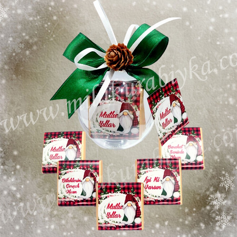 5 adet yılbaşı temalı sargılı, Pelit marka sütlü madlen çikolata şeffaf küre içinde hazırlanmakta ve görseldeki şekilde süslenmektedir.
