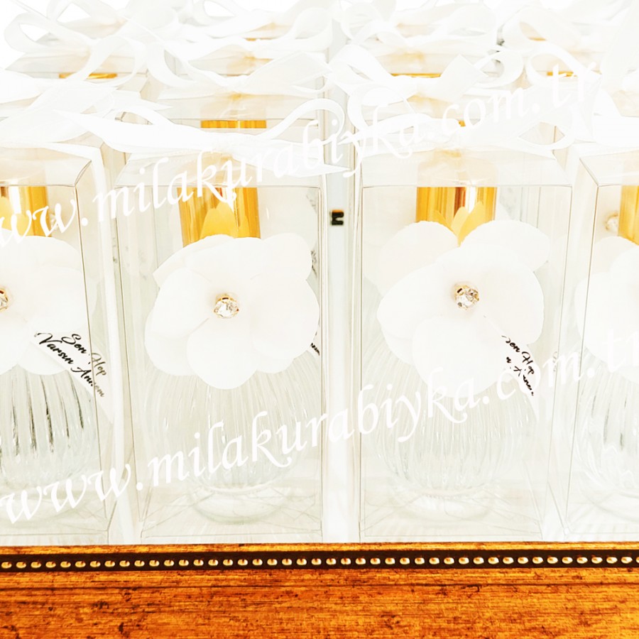 50 cc şeffaf kutulu, gold kapaklı cam sprey şişeli kolonya, beyaz çiçek ve tek taş süslemeli kişiye özel etiketli söz, nişan, nikah, düğün, doğum günü, mevlüt ve bebek hediyesi