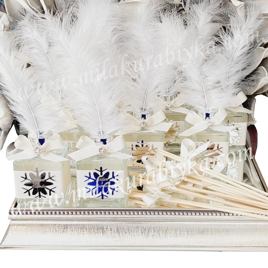 Kutulu ve bambu çubuklu, kurdele süslemeli ve pleksi isim plakalı 50 cc kare cam şişeli oda kokusu, baby shower, doğum, mevlüt, doğum günü, sünnet, söz-nişan-nikah hediyelik