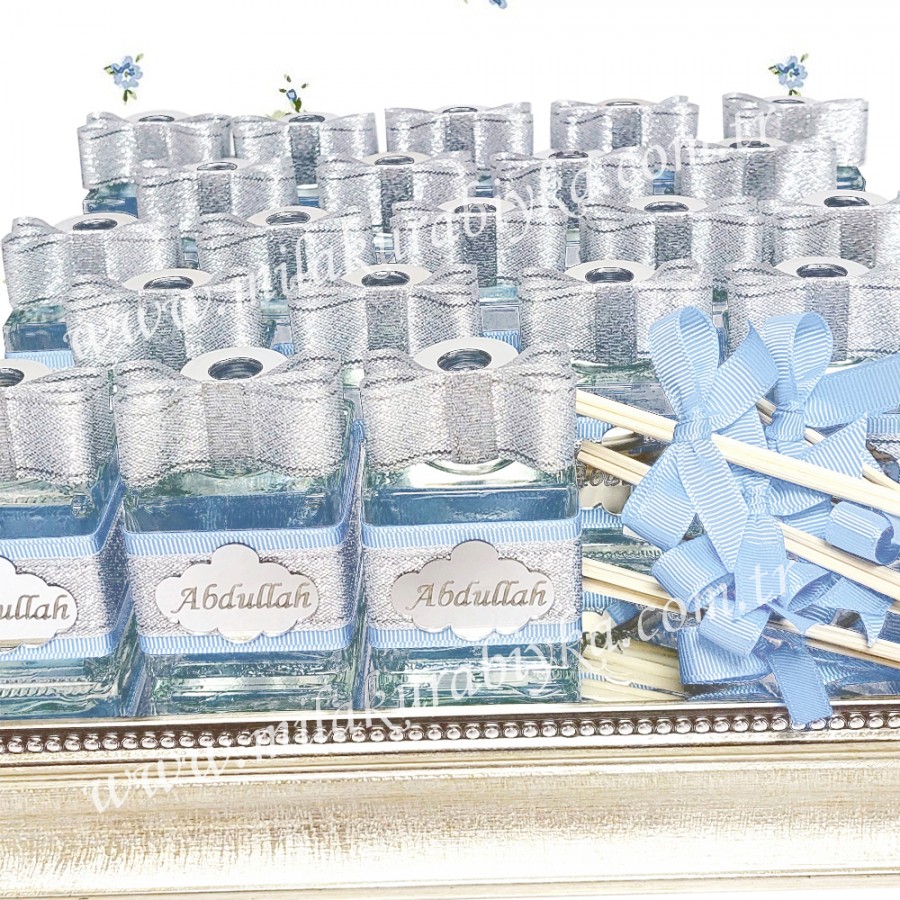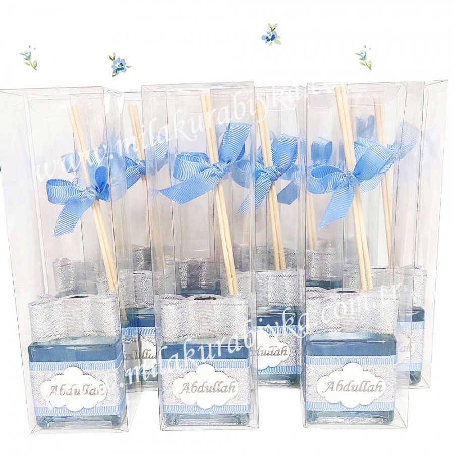 Kutulu ve bambu çubuklu, mavi ve simli gümüş kurdele süslemeli ve pleksi isim plakalı 50 cc kare cam şişeli oda kokusu, baby shower, bebek, mevlüt, sünnet ve doğum günü hediyesi.